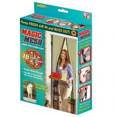 Москитная сетка на магнитах обладает многими достоинствами. Она состоит из двух мягких полотен, которые бесшумно и быстро смыкаются при прохождении сквозь них.Москитная сетка на магнитах Magic mesh крепится на проем двери при помощи двусторонней липкой ленты или прикалывается кнопками. А когда вы проходите, благодаря 18-и магнитам штора автоматически закрывается прямо за вами.