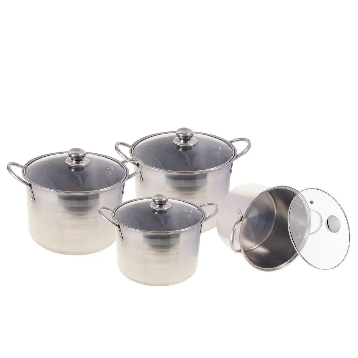 Большой набор кухонной посуды: 4 кастрюли из нержавейки и 4 стеклянные крышки к ним. Такой комплект обеспечит вас качественными кастрюлями для самых разнообразных процессов.