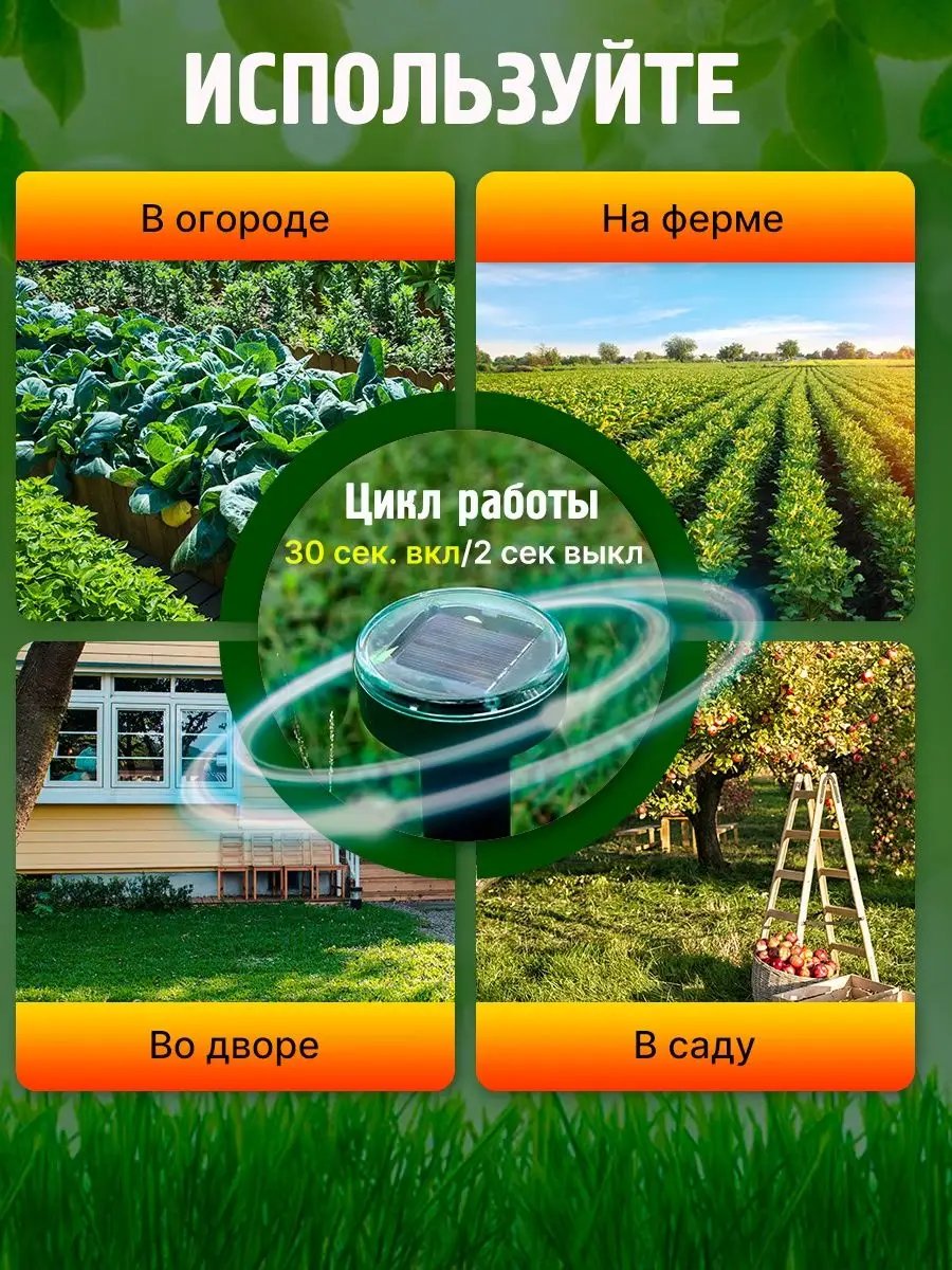 - Универсальность применения: Отпугиватель подходит для использования на любых участках земли, в садах, огородах, на фермерских хозяйствах и других территориях.